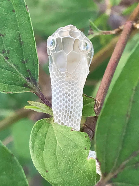 Wow! Look what James spotted in our roughleaf dogwood Sunday evening–a fairly fresh snake shed that looks like a ghost snake. It was probably a rough greensnake (Opheodrys aestivus). The snake wrapped itself around the limbs, slithered right out and left a perfect shed for me to put in my box of nature treasures.